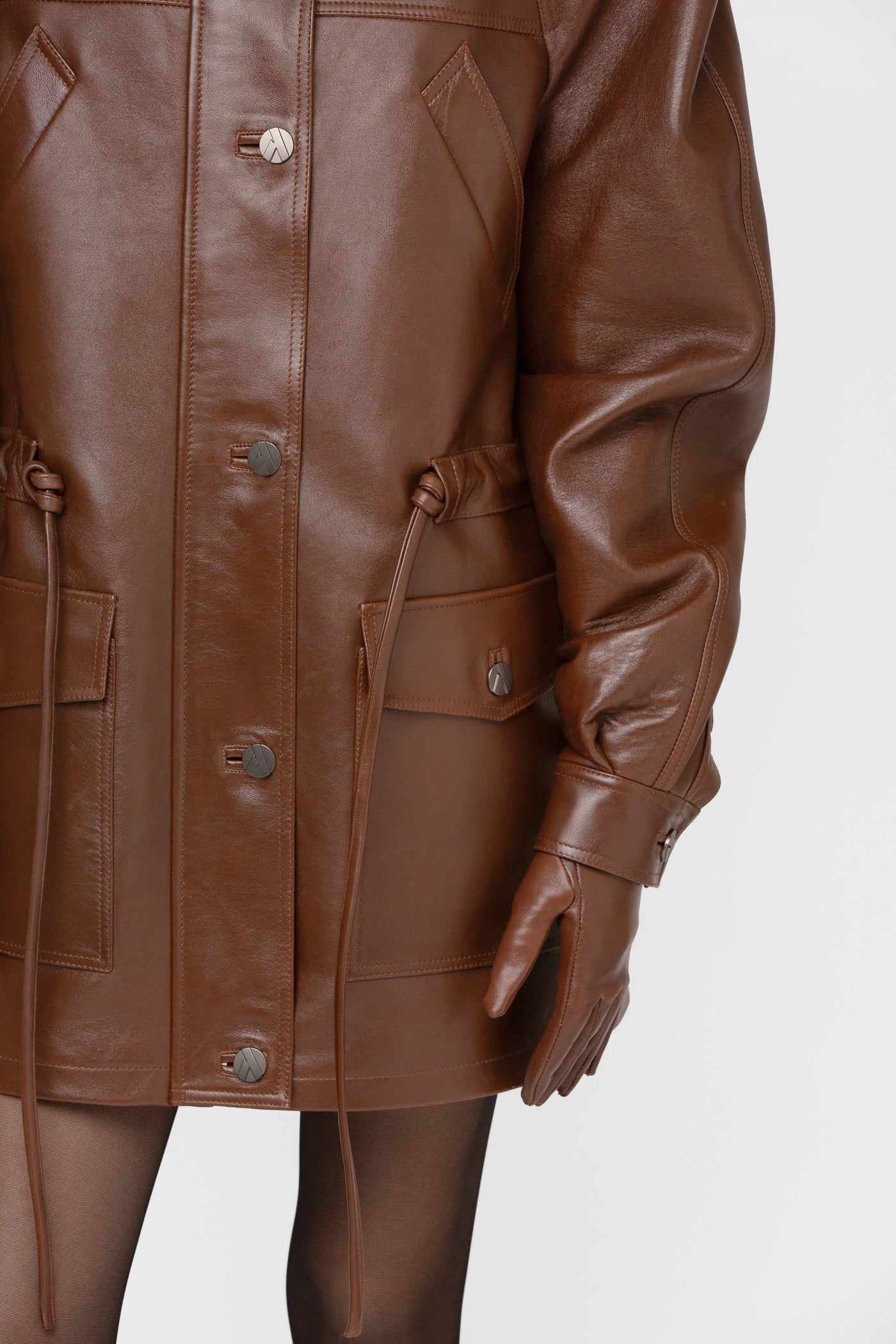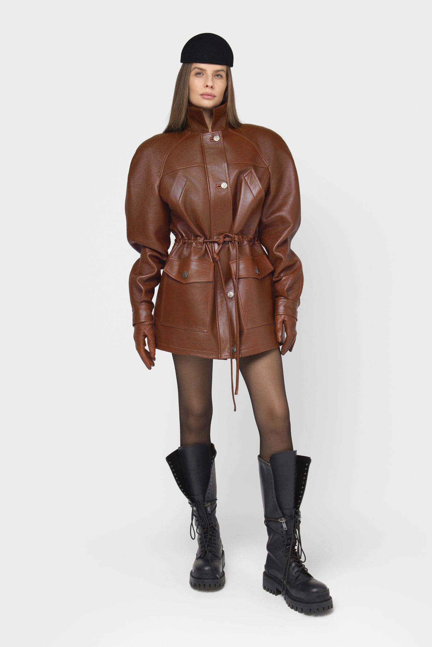 Moderni, struktūruota ir šiuolaikiška striukė, pasiūta iš natūralios odos. Kaštoninės spalvos modelis su vienborčiu – paslėptu užsegimu, kuris sukuria švarų, estetišką vaizdą. Baltininė apykaklė ir dekoratyvinės vardinės metalinės sagos subtiliai pabrėžia išskirtinį modelio charakterį.