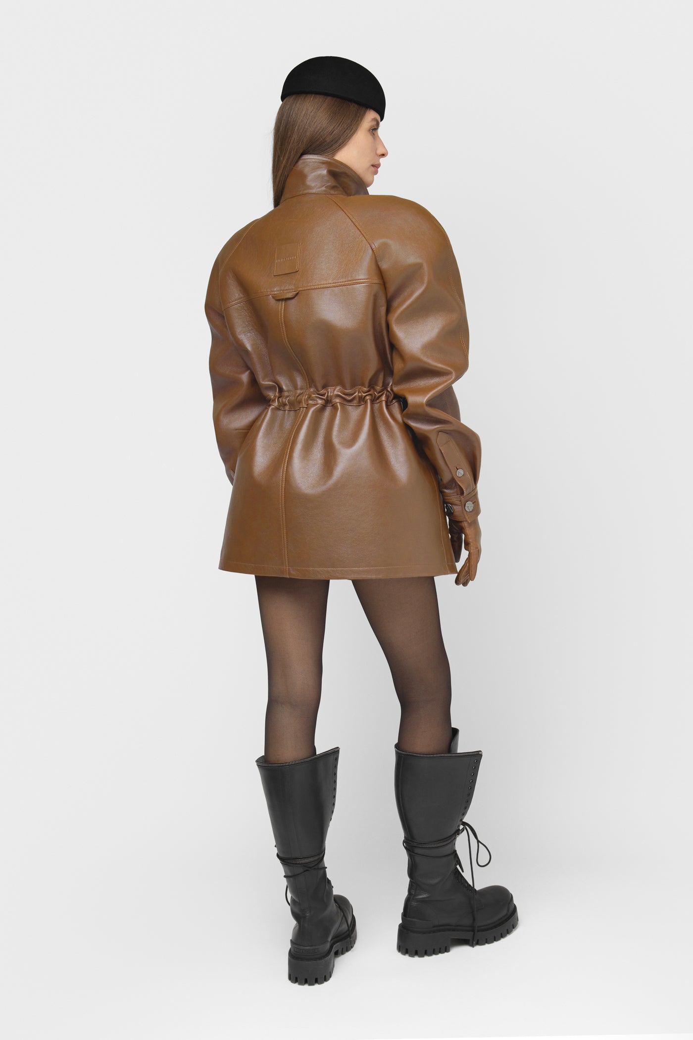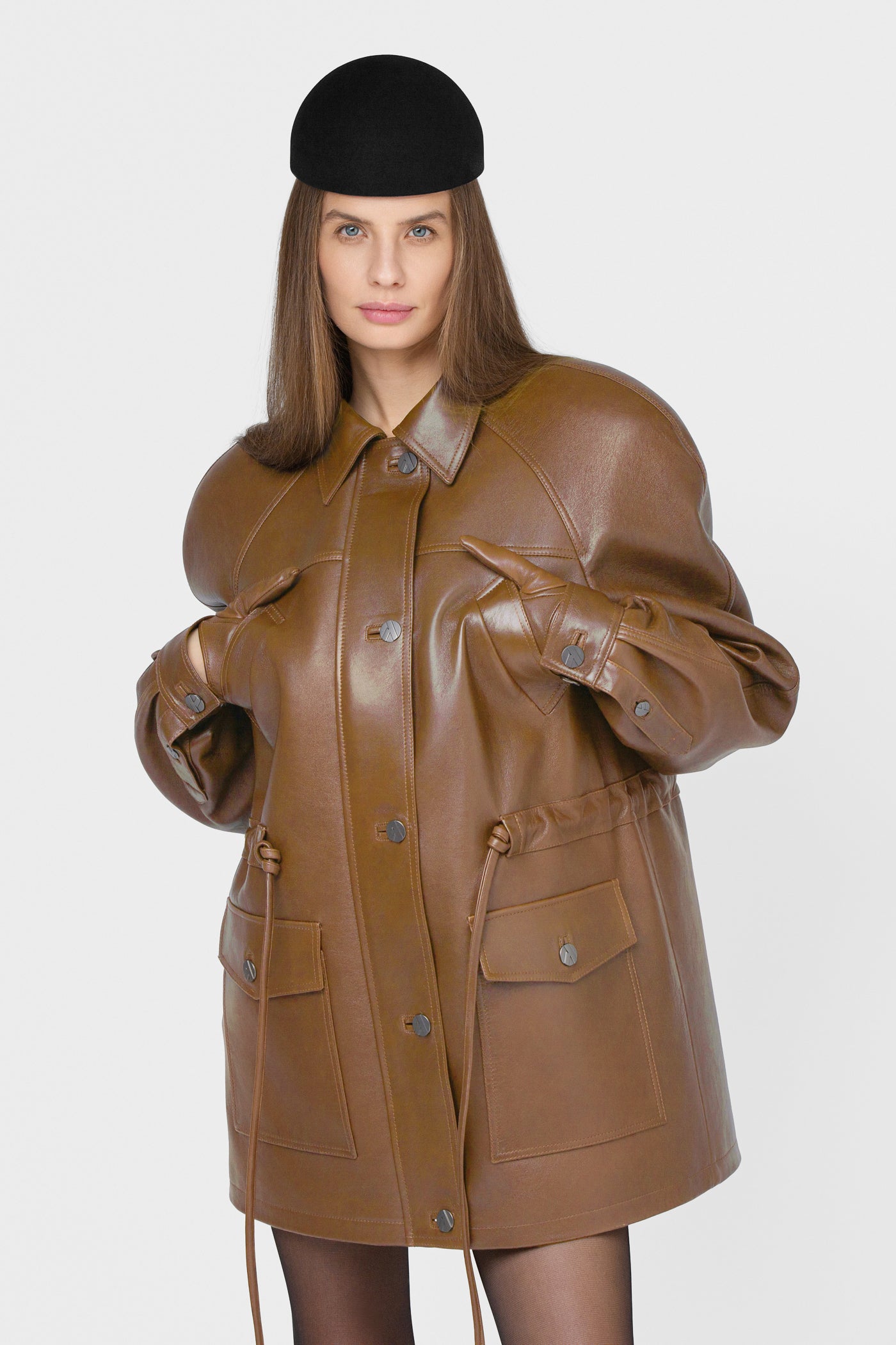 Moderni, struktūruota ir šiuolaikiška striukė, pasiūta iš natūralios odos. Smėlio spalvos modelis su vienborčiu – paslėptu užsegimu, kuris sukuria švarų, estetišką vaizdą. Baltininė apykaklė ir dekoratyvinės vardinės metalinės sagos subtiliai pabrėžia išskirtinį modelio charakterį.