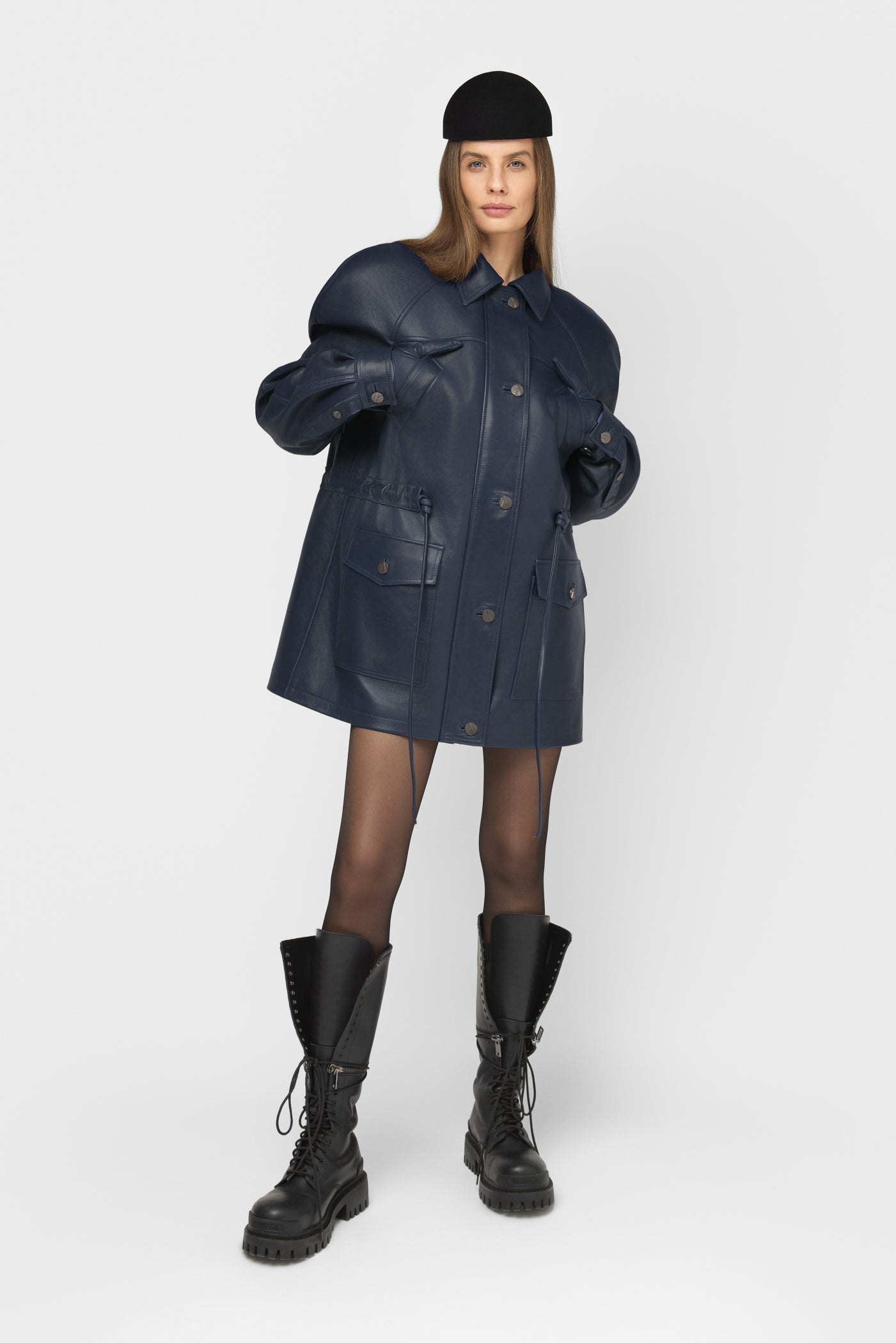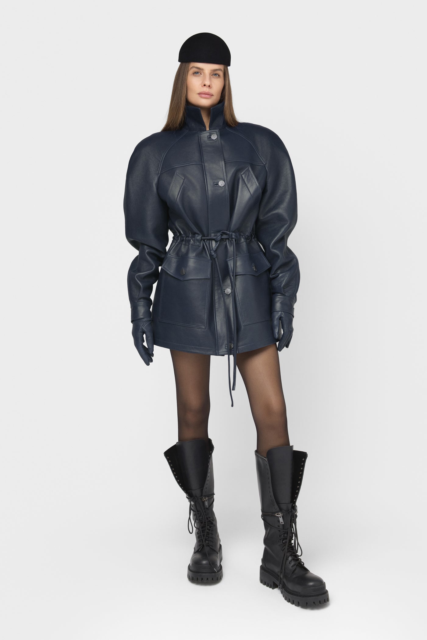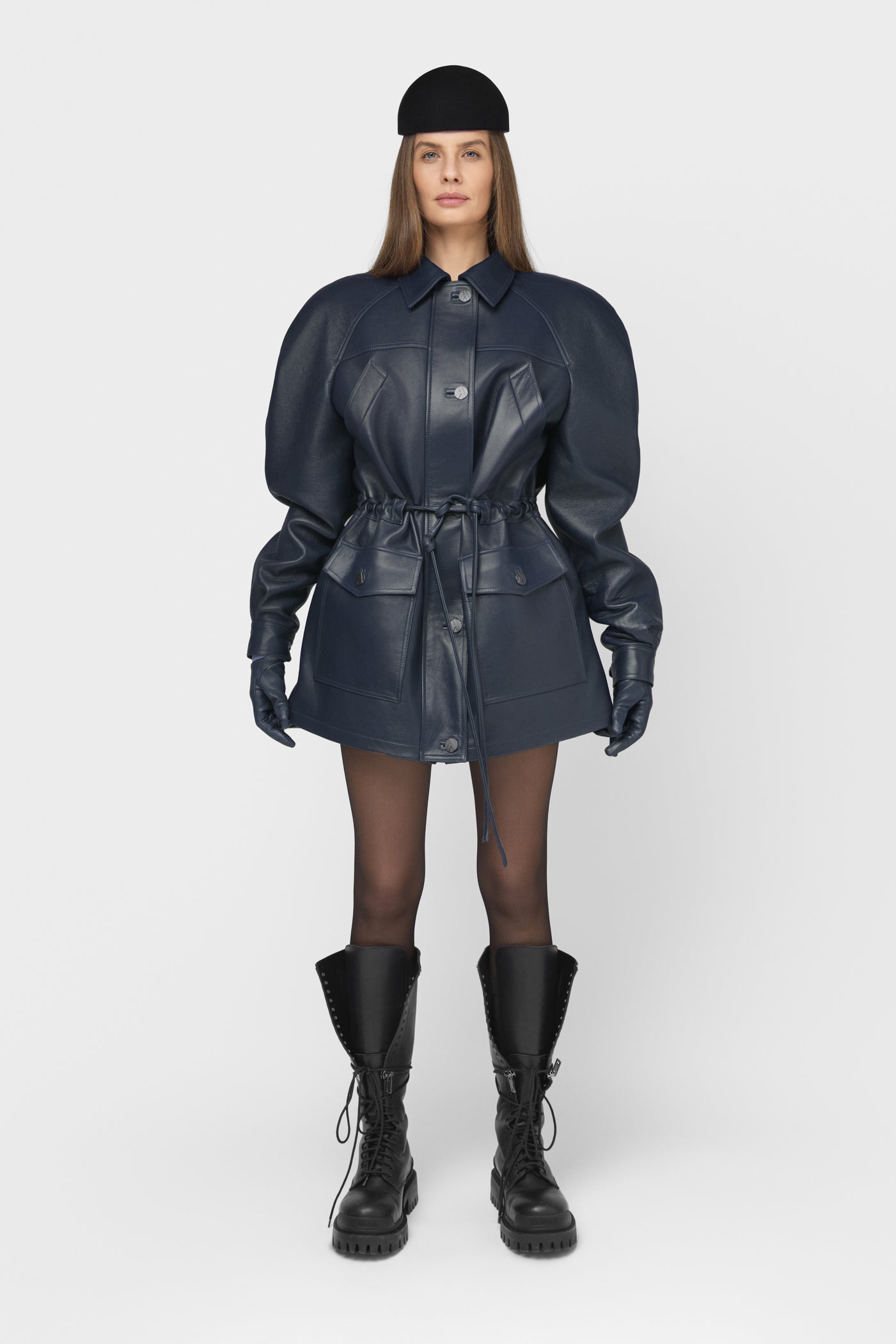 Moderni, struktūruota ir šiuolaikiška striukė, pasiūta iš natūralios odos. Mėlynos spalvos modelis su vienborčiu – paslėptu užsegimu, kuris sukuria švarų, estetišką vaizdą. Baltininė apykaklė ir dekoratyvinės vardinės metalinės sagos subtiliai pabrėžia išskirtinį modelio charakterį.