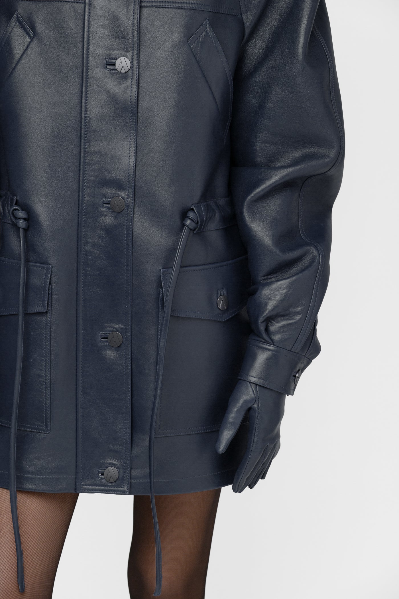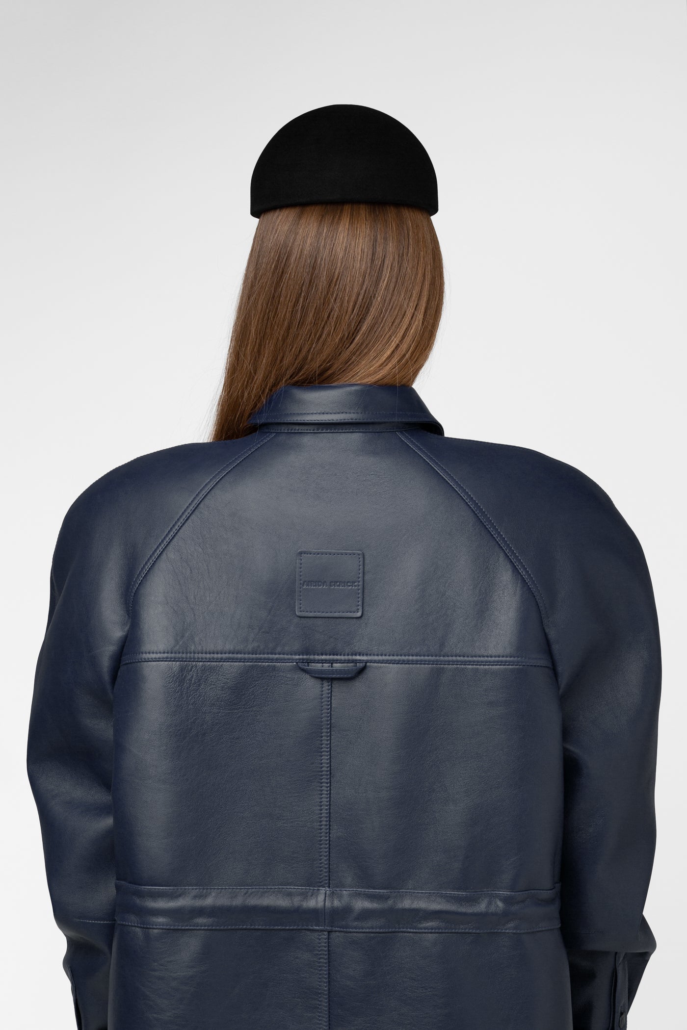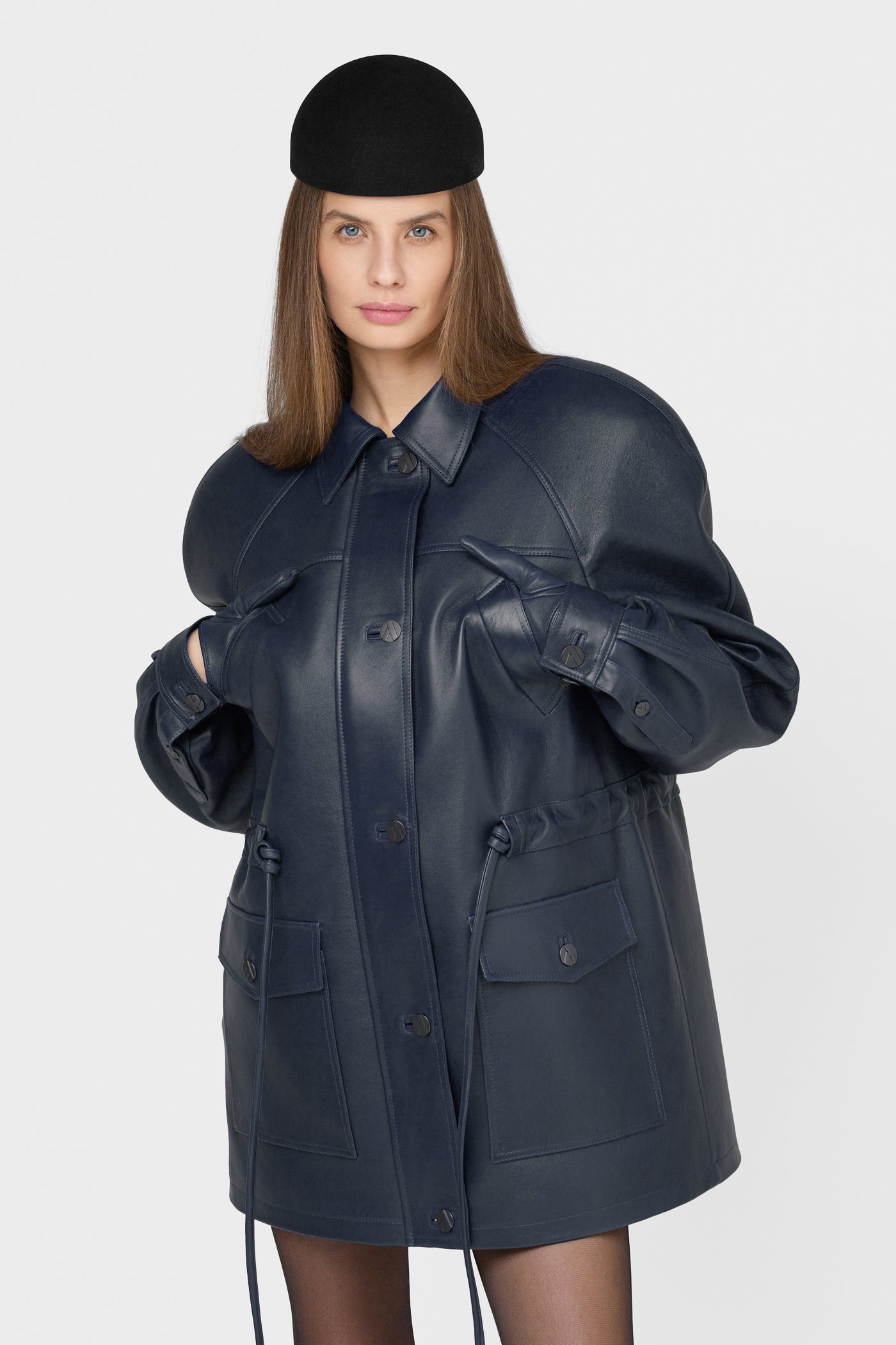Moderni, struktūruota ir šiuolaikiška striukė, pasiūta iš natūralios odos. Mėlynos spalvos modelis su vienborčiu – paslėptu užsegimu, kuris sukuria švarų, estetišką vaizdą. Baltininė apykaklė ir dekoratyvinės vardinės metalinės sagos subtiliai pabrėžia išskirtinį modelio charakterį.