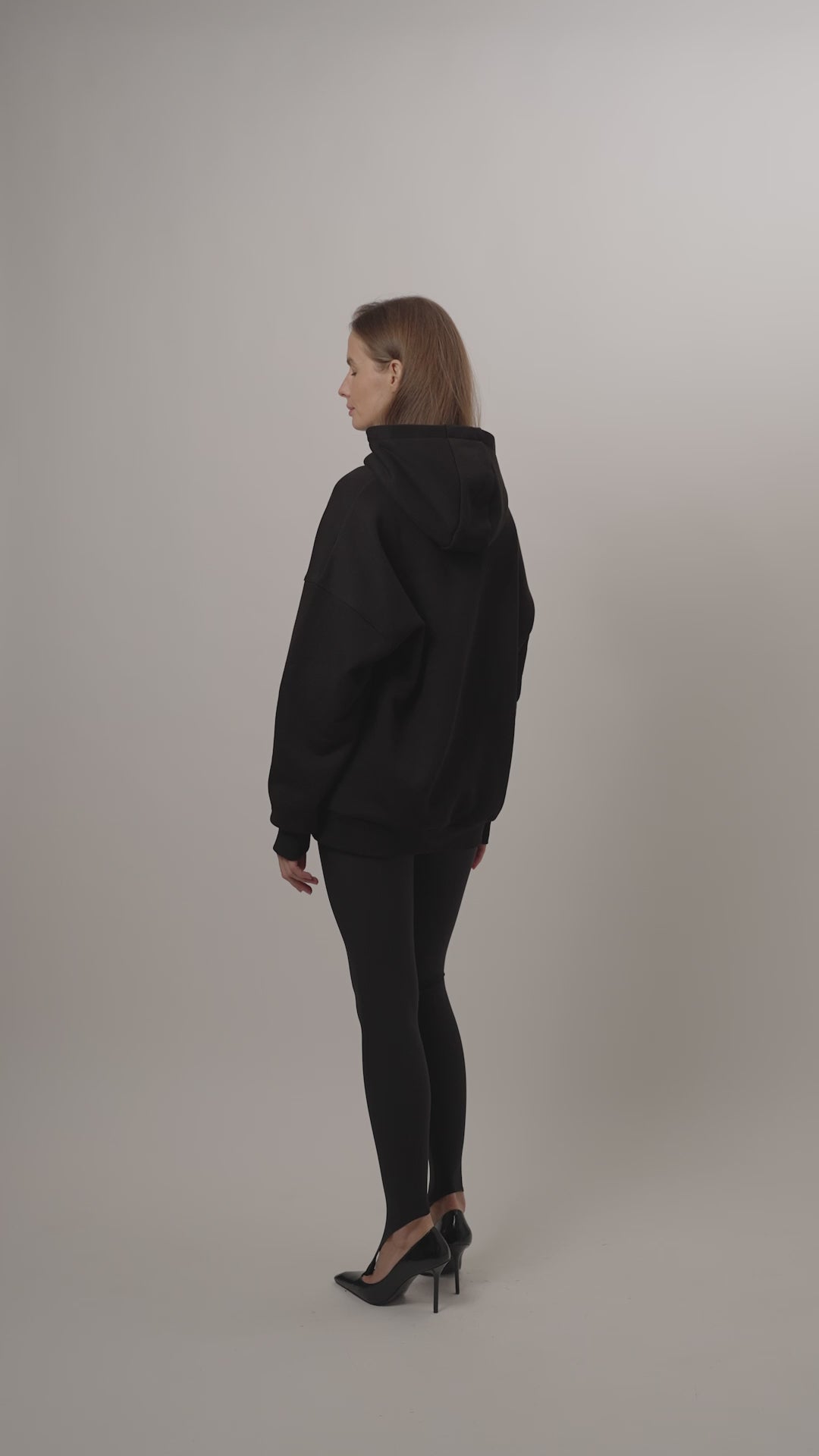 Juodas, džemperis su kapišonu, laisvo silueto su ilgomis nuleistomis rankovėmis, megztais rankogaliais, ir juosmeniu, priekyje prisiūta kengūros tipo kišenė. Gaminys pasiūtas iš minkšto audinio su pūku. Džemperio priekis kairėje pusėje dekoruotas juodu 3D logotipo dekoru. Modelis nevaržo judesių, tinka pasyviam ir aktyviam polsiui.