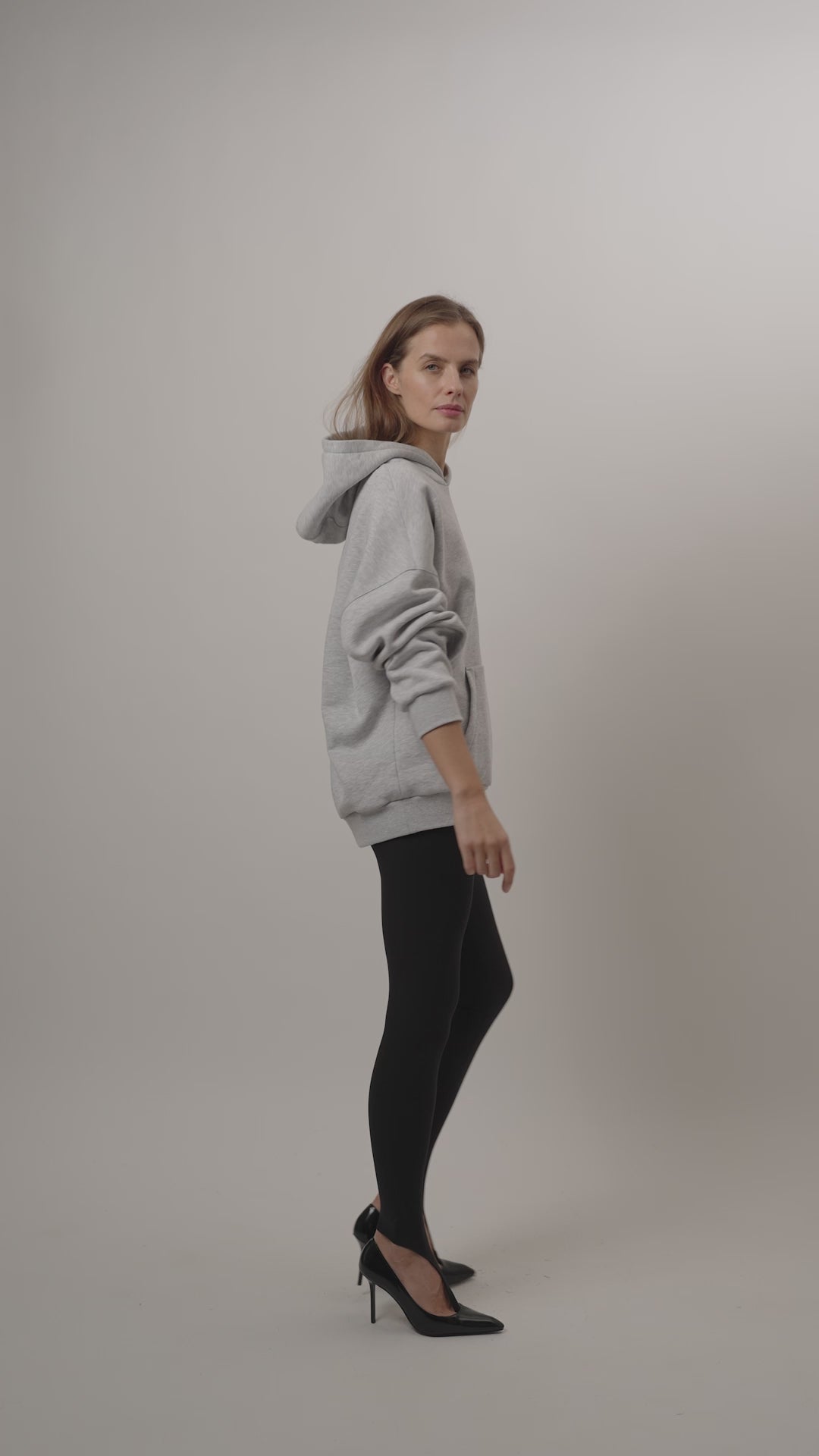 Šviesiai pilkas džemperis su kapišonu, laisvo silueto su ilgomis nuleistomis rankovėmis, megztais rankogaliais, ir juosmeniu, priekyje prisiūta kengūros tipo kišenė. Gaminys pasiūtas iš minkšto audinio su pūku. Džemperio priekis kairėje pusėje dekoruotas juodu 3D logotipo dekoru. Modelis nevaržo judesių, tinka pasyviam ir aktyviam polsiui.