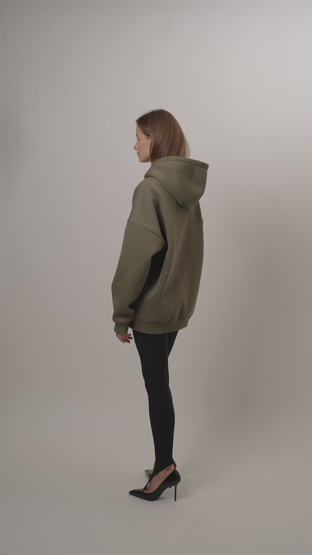 Chaki spalvos džemperis su kapišonu, laisvo silueto su ilgomis nuleistomis rankovėmis, megztais rankogaliais, ir juosmeniu, priekyje prisiūta kengūros tipo kišenė. Gaminys pasiūtas iš minkšto audinio su pūku. Džemperio priekis kairėje pusėje dekoruotas juodu 3D logotipo dekoru. Modelis nevaržo judesių, tinka pasyviam ir aktyviam polsiui.