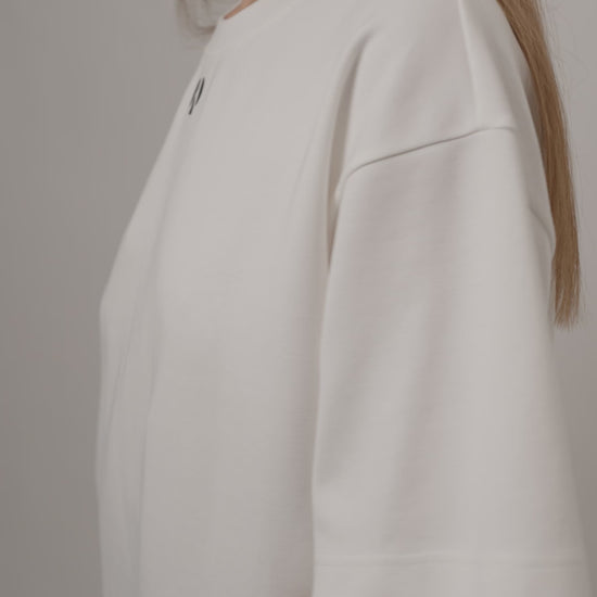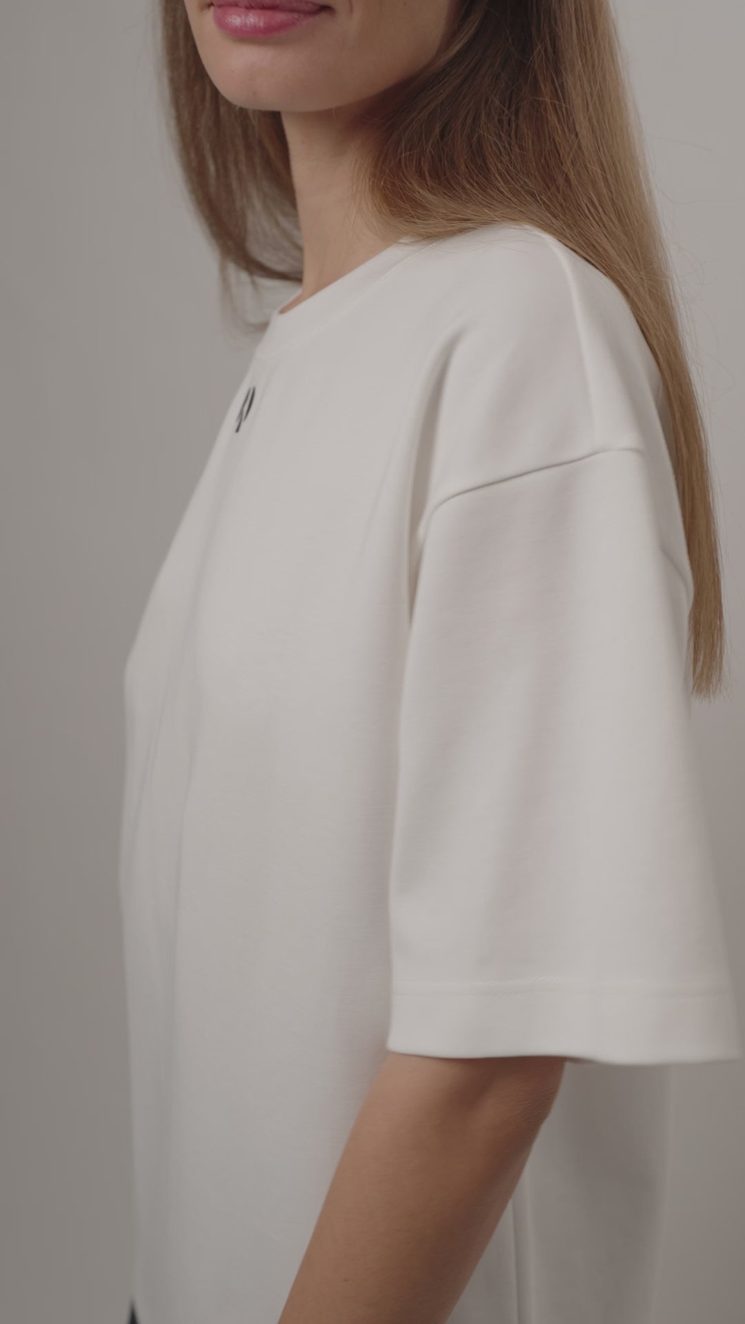 Pieno baltumo (off white) standaus trikotažo, oversized stiliaus marškinėliai su apvalia apykakle. Platus, tiesus kirpimas, nuleistos rankovės. Marškinėliai su juodu 3D logotipo dekoru centre prie kaklo.