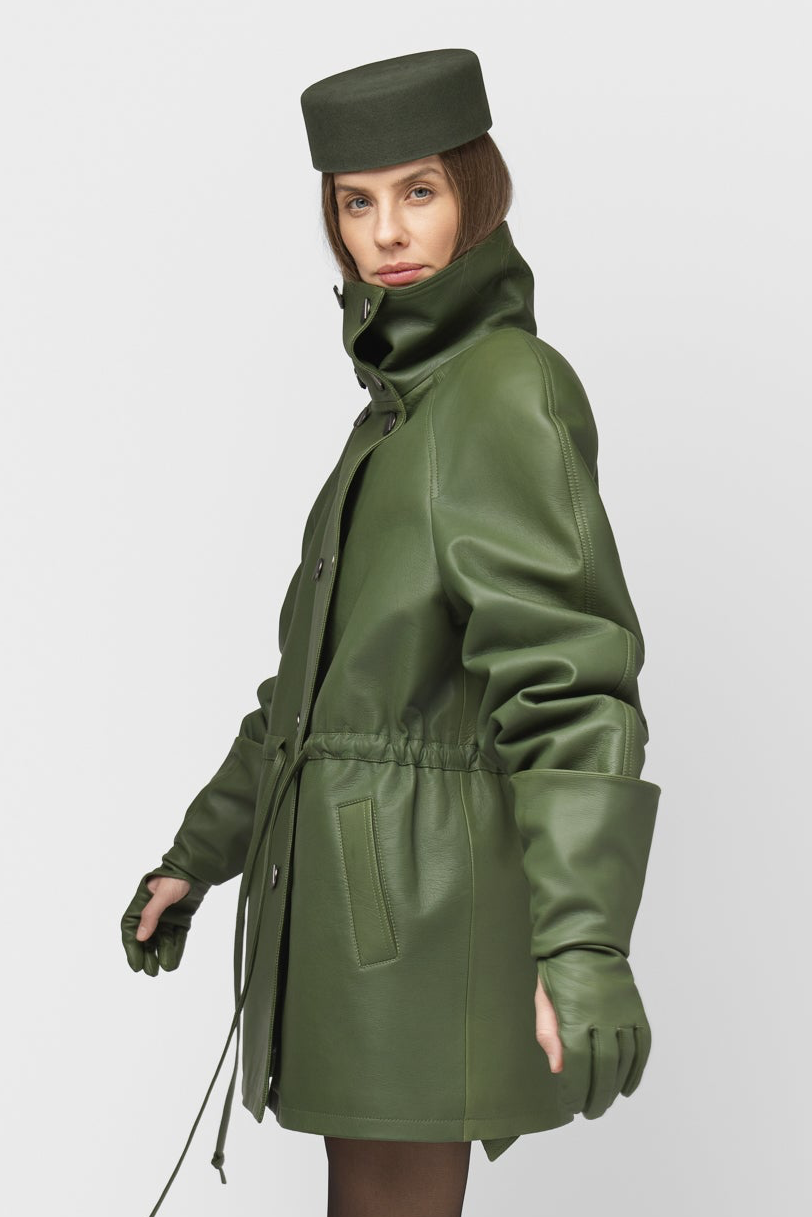 Cilindro formos alyvuogių žalios spalvos, minimalistinė skrybėlė, įkūnijanti šiuolaikinę eleganciją. Rankų darbo, pagaminta iš aukščiausios kokybės triušio vilnos veltinio, ši skulptūriška skrybėlė išsiskiria aiškiomis architektūrinėmis linijomis ir rafinuotu siluetu. Viduje – prabangus natūralaus šilko pamušalas bei odinė juosta su HATKAS x SKRICK kolaboracijos logotipu. Galinėje dalyje – dekoratyvinis juodo metalo SKRICK ženklas, kuris subtiliai užbaigia modernų įvaizdį.
