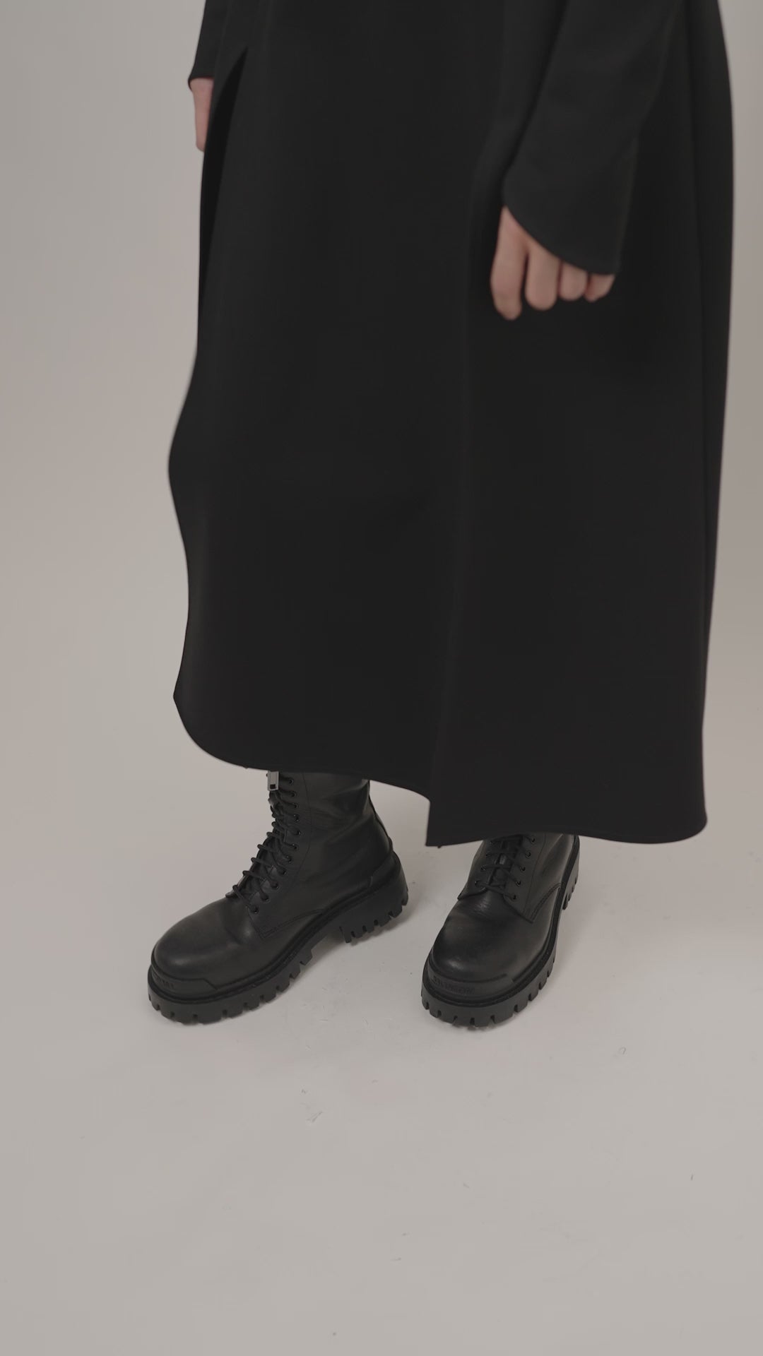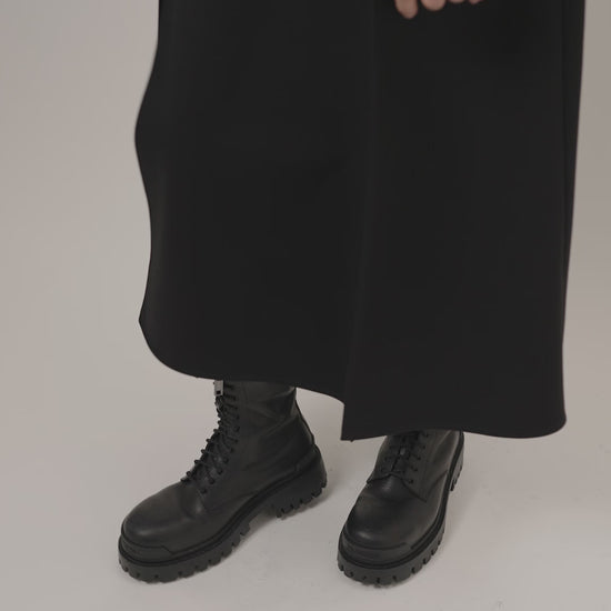 Stilinga ir struktūruota – ši suknelė pasiūta iš standaus trikotažo išsiskiria išraiškingais silueto akcentais. Prigludusi viršutinė dalis su kvadratine atvira apykakle subtiliai pabrėžia iškirptę ir pečių liniją. Ilgos rankovės su reglano siūlėmis ir išraiškingai pakeltais peteliais kuria stiprų, moterišką įvaizdį. Du gilūs šoniniai skeltukai suteikia suknelės judesiui lengvumo, gale įsiūtas slaptas užtrauktukas, o standus, bet gražiai krintantis trikotažas nesiglamžo – puikus pasirinkimas tiek dienai, tiek vakarui.
