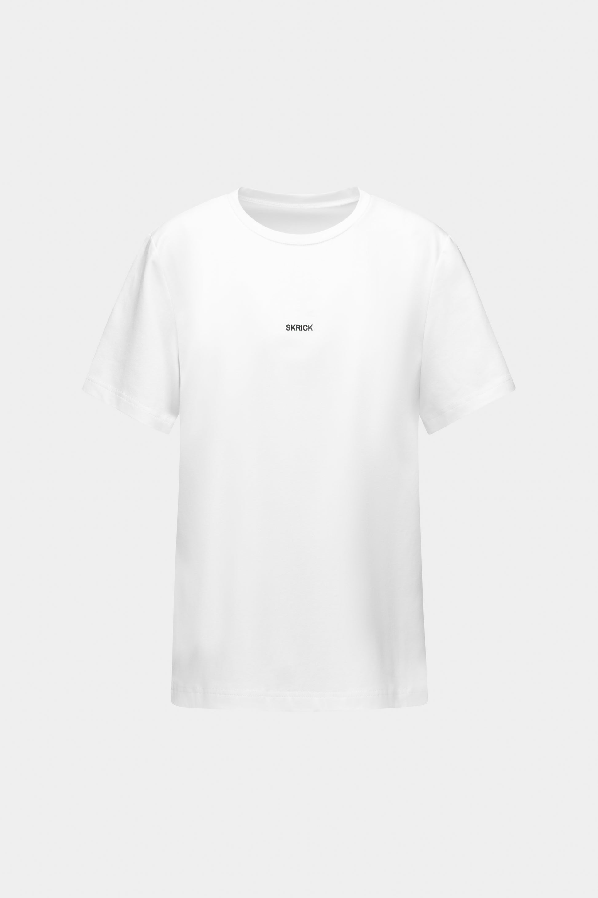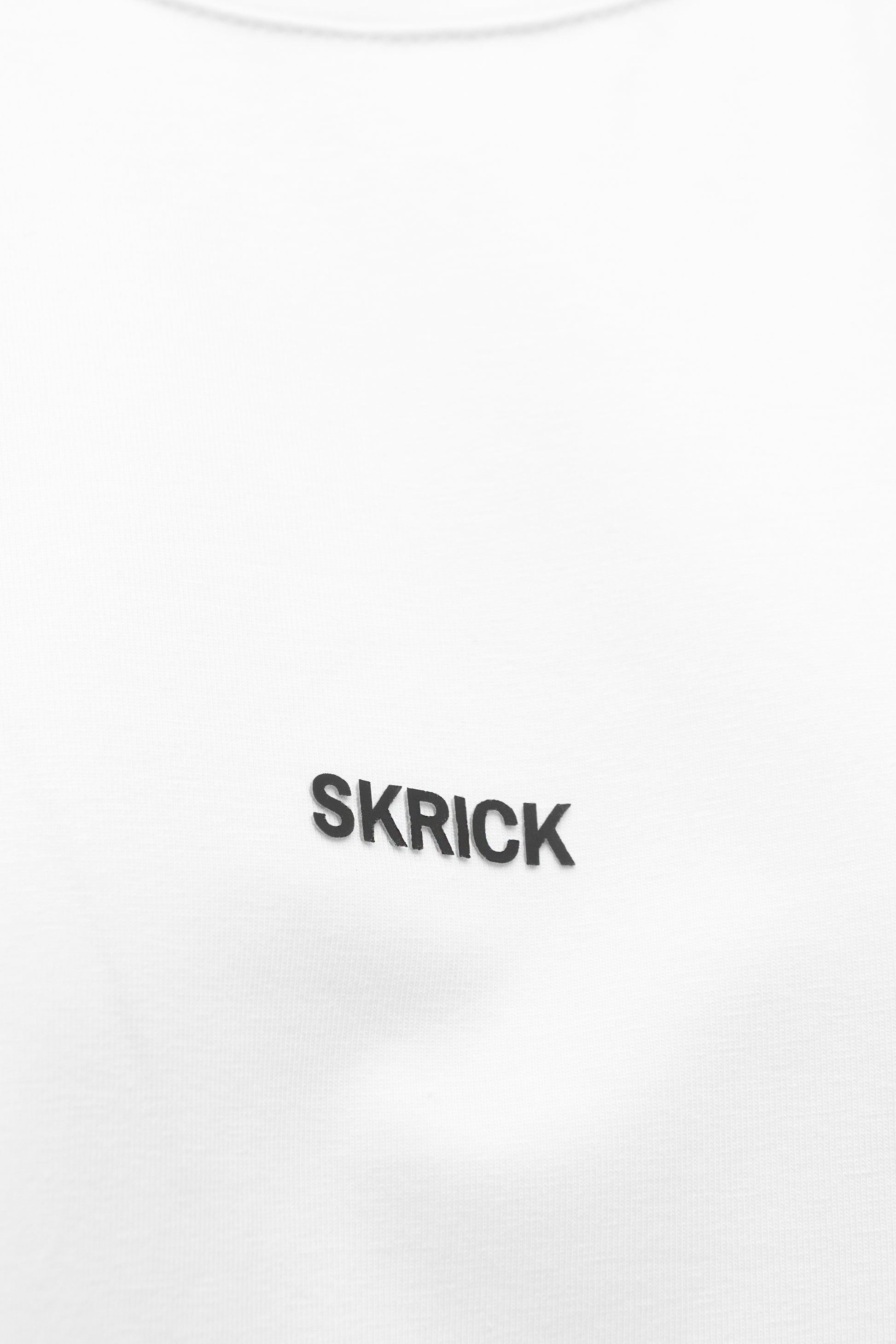 Centre, virš krūtinės – juodas klijuojamas 3D SKRICK logotipo dekoras, suteikiantis minimalistinį ir modernų akcentą.